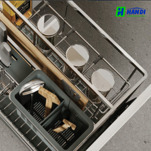 Giá dao thớt được trang bị cơ chế trượt ray âm giảm chấn, giúp bạn dễ dàng kéo ra và đóng vào một cách nhẹ nhàng, êm ái. Cơ chế này không chỉ tăng tuổi thọ của sản phẩm mà còn mang đến sự tiện nghi và thoải mái cho người sử dụng.