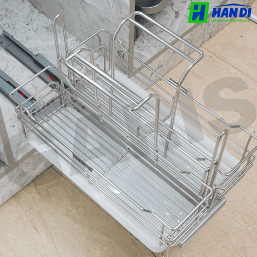 Sản phẩm được trang bị ray âm giảm chấn, giúp việc đóng mở tủ trở nên êm ái, nhẹ nhàng, không gây tiếng ồn khó chịu. Bên cạnh đó, 2 khay hứng nước đi kèm giúp ngăn chặn nước nhỏ giọt từ chai lọ, bảo vệ tủ bếp khỏi ẩm mốc và hư hỏng.