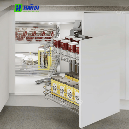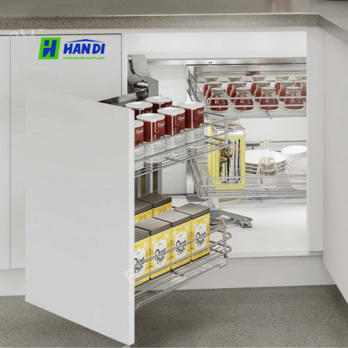 Cơ chế hoạt động: Cơ chế liên hoàn (Magic Corner), khi kéo cánh tủ ra, 2 rổ gắn trên cánh sẽ kéo ra, đồng thời 2 rổ phía trong góc tủ sẽ tự động trượt ra theo.