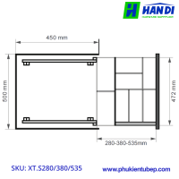 - Kích thước sản phẩm R380mm để lắp cho tủ có khay rộng 700mm cần 2 bộ gồm: 01 bộ R280mm+01 bộ R380mm