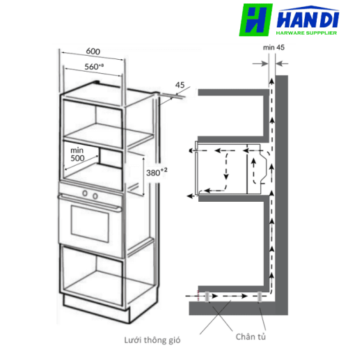 Khe thoát gió phía sau cách vách tủ tối thiểu 45mm