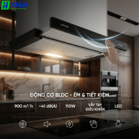 Với động cơ BLDC, máy hút mùi không chỉ hoạt động mạnh mẽ mà còn rất hiệu quả về mặt năng lượng. Lực hút 900 m³/h được tối ưu hóa nhờ vào công nghệ động cơ tiên tiến, giúp không khí trong bếp được lưu thông và làm sạch một cách nhanh chóng, hiệu quả nhất.