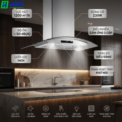 Với lực hút lên đến 1200 m³/h, EHM2270-Eurogold có khả năng xử lý nhanh chóng và hiệu quả mọi loại mùi, từ những món ăn thông thường đến các món chiên xào nhiều dầu mỡ. Công suất động cơ 230W đảm bảo hiệu suất hoạt động ổn định và bền bỉ theo thời gian. Đáng chú ý, độ ồn của máy chỉ khoảng ~50db, mang lại không gian bếp yên tĩnh, không gây khó chịu cho người sử dụng ngay cả khi hoạt động ở công suất cao.