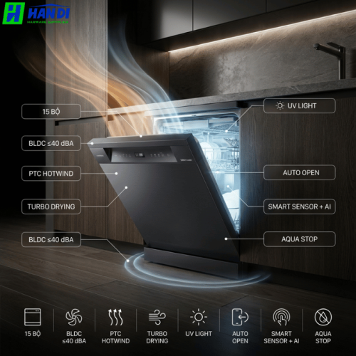Chức năng Delay Start (khởi động trễ) mang đến sự linh hoạt trong việc lên lịch rửa, giúp bạn chủ động hơn trong sinh hoạt hàng ngày. Auto Open (tự động mở cửa) là một tính năng thông minh, giúp hơi nước thoát ra ngoài sau khi chu trình rửa kết thúc, làm bát đĩa khô ráo hơn và tiết kiệm năng lượng cho quá trình sấy.