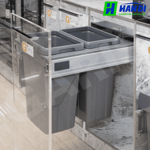 Điểm nổi bật của sản phẩm này chính là cơ chế cánh kéo thông minh. Thùng rác được thiết kế để gắn vào cánh tủ bếp dưới, khi mở cánh tủ, thùng rác sẽ tự động kéo ra, giúp bạn dễ dàng vứt rác mà không cần phải cúi người hay chạm tay trực tiếp vào thùng. Điều này không chỉ mang lại sự tiện lợi mà còn đảm bảo vệ sinh cho người sử dụng.