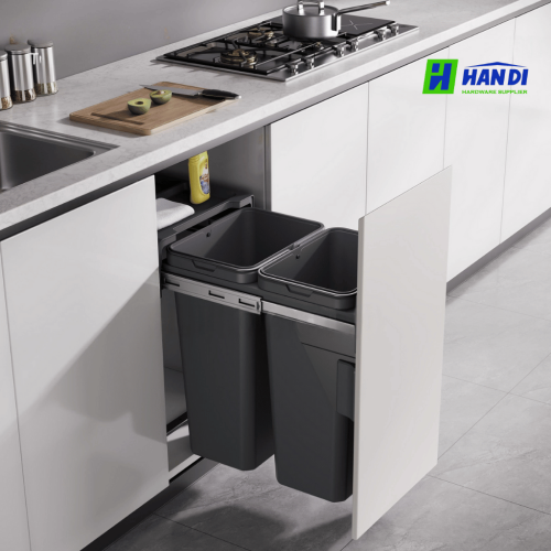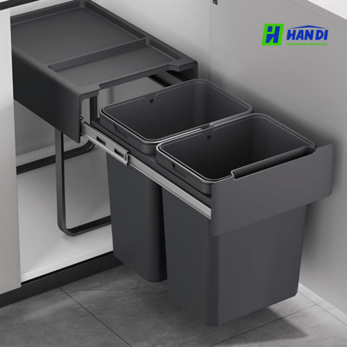 Cơ chế hoạt động: Ray trượt giảm chấn, nắp thùng tự động mở/đậy khi cánh tủ được kéo/đẩy.