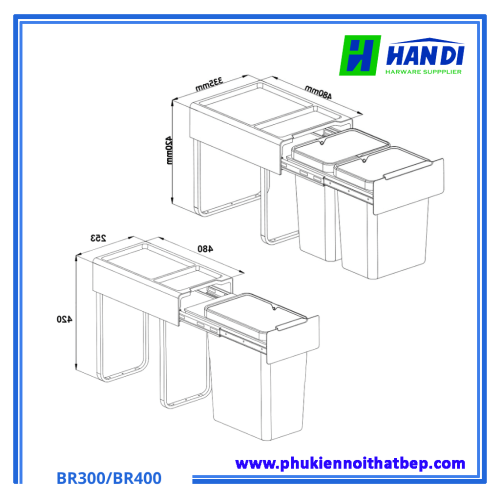 Dưới đây là thông tin chi tiết về dòng sản phẩm Thùng rác gắn cánh giảm chấn Eurogold BR300 và BR400: