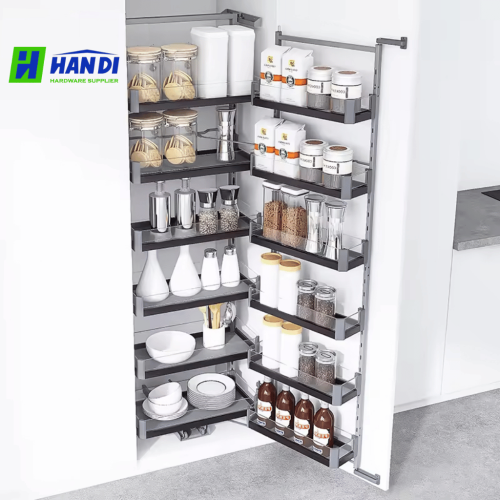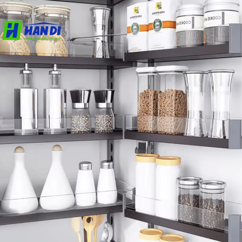 Cơ chế hoạt động: Cánh mở kéo ra, toàn bộ giá sẽ trượt ra ngoài khoang tủ.