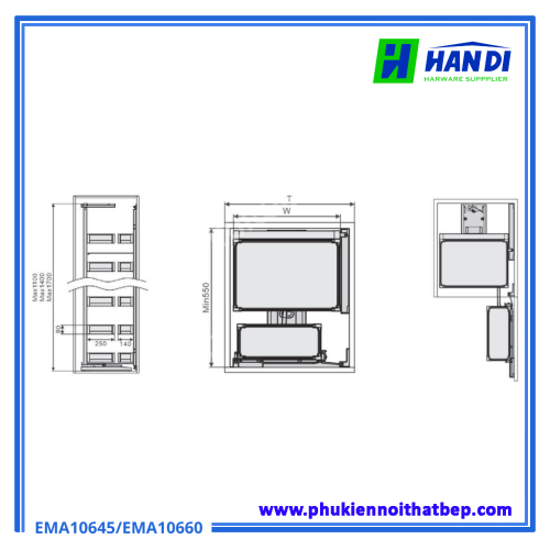 - Mã EMA10645 (Tủ 450mm): Kích thước lọt lòng: W415 x D500 x H(Lớn hơn 1720) mm.