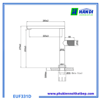 Kích thước sản phẩm: Cao 275 ± 3 (mm), chiều cao từ mặt bàn đến đầu vòi 253 ± 3 (mm).