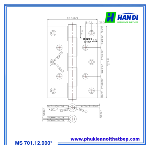 Kích thước chi tiết của Bản lề bi IMUNDEX - 701.32.900** - 127x89x3.0mm - Chất liệu INOX 316