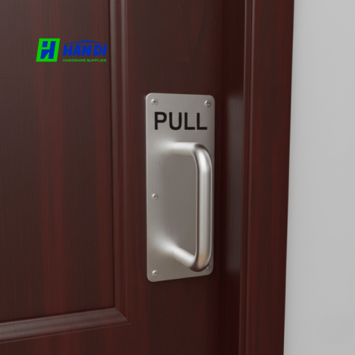 Cấu tạo thiết kế: Kết hợp giữa tấm inox phẳng in chữ "PULL" và tay nắm dạng ống tròn dài 150mm được gắn chắc chắn trên bề mặt.