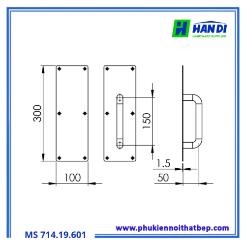 Với kích thước (Rộng x Sâu x Cao) là 100 x 50 x 300 mm, bảng kéo cửa này có độ nhô tay nắm 50mm, tạo khoảng cách vừa đủ để thao tác kéo mở cửa một cách dễ dàng mà không bị vướng víu.