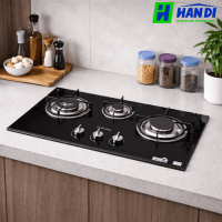 Bếp ga 3 vùng nấu, mặt kính cường lực màu đen.