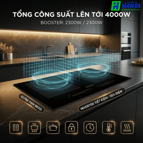 Sản phẩm sở hữu hai vùng nấu cảm ứng điện từ với công suất lên đến 2000W mỗi bên, có thể đẩy lên 2300W với chức năng Booster. Khả năng gia nhiệt gấp đôi so với bếp truyền thống giúp rút ngắn thời gian nấu nướng đáng kể, tiết kiệm thời gian cho người nội trợ.