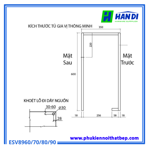 Sản phẩm có nhiều kích thước khác nhau, phù hợp với chiều rộng tủ 600mm, 700mm, 800mm và 900mm. Cụ thể, kích thước sản phẩm như sau: