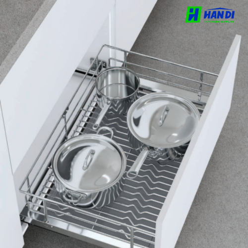 Ray âm giảm chấn giúp giá xoong nồi hoạt động êm ái, không gây tiếng ồn khi kéo ra hoặc đẩy vào. Cơ cấu trượt này cũng giúp tăng tuổi thọ của sản phẩm, mang lại trải nghiệm sử dụng tuyệt vời cho người dùng.