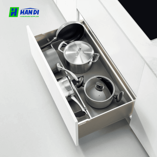 Hệ thống ray trượt âm giảm chấn giúp Giá xoong nồi Nhôm Anode Eurogold vận hành êm ái, không gây tiếng ồn khi kéo ra hoặc đẩy vào. Cơ chế giảm chấn giúp bảo vệ tủ bếp và các vật dụng bên trong khỏi va đập, tăng độ bền cho sản phẩm. Đây là một chi tiết quan trọng thể hiện sự tinh tế và chất lượng của sản phẩm.