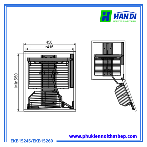 - Mã EKB15245(Tủ 450mm): Kích thước lọt lòng: W415 x D500 x H600 mm.