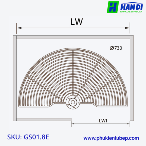 Để giúp bạn hiểu rõ hơn về sản phẩm, dưới đây là thông số kỹ thuật chi tiết của Hệ mâm xoay góc tủ bếp GARIS GS01.8E:
