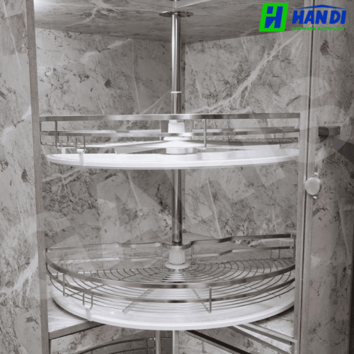 Với tải trọng lên đến 25kg, bạn có thể thoải mái lưu trữ các vật dụng nhà bếp nặng như xoong, nồi, chảo mà không lo hệ mâm xoay bị quá tải. Điều này giúp bạn tận dụng tối đa không gian lưu trữ và giữ cho căn bếp luôn gọn gàng.