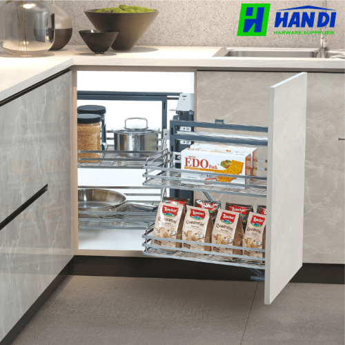 - Nhà bếp: Đây là ứng dụng phổ biến nhất. Sản phẩm giúp giải quyết hiệu quả không gian góc tủ bếp, lưu trữ bát đĩa, xoong nồi, thực phẩm khô, gia vị, các dụng cụ nhà bếp khác.