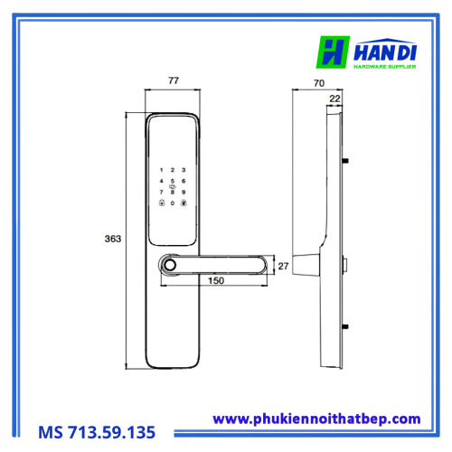 Kích thước mặt khóa: 363mm (cao) x 77mm (rộng)