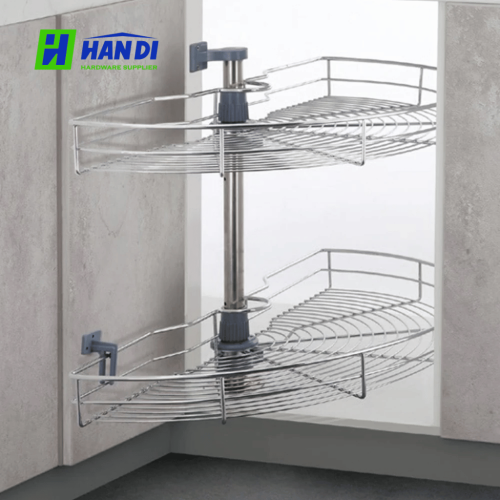 Sản phẩm được thiết kế dạng nửa hình tròn (bán nguyệt), giúp tận dụng tối đa không gian góc tủ bếp dưới. Cấu tạo mâm dạng nan tròn không chỉ mang lại vẻ đẹp hiện đại mà còn giúp thoáng khí, tránh ẩm mốc cho đồ dùng bên trong. Trụ đỡ cố định, gắn vào đáy và nóc tủ, đảm bảo sự chắc chắn và ổn định trong quá trình sử dụng.