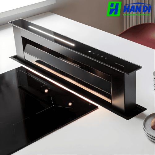 Điểm nổi bật nhất của Máy hút mùi âm bàn MALLOCA Downdraft K-900BM chính là thiết kế Downdraft, hay còn gọi là hút âm bàn. Thay vì lắp đặt phía trên bếp, thiết bị này được tích hợp ngay bên dưới mặt bàn bếp, chỉ lộ ra phần lưới lọc và bảng điều khiển khi hoạt động. Điều này tạo ra một bề mặt bếp liền mạch, gọn gàng, đặc biệt phù hợp với các căn bếp có diện tích hạn chế hoặc theo phong cách tối giản, hiện đại.