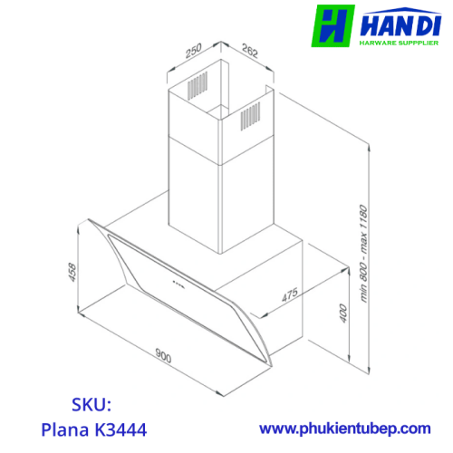 - Kích thước: W900 x D475 x H(880-1180)mm, kích thước tiêu chuẩn phù hợp với hầu hết các không gian bếp và các loại bếp nấu.