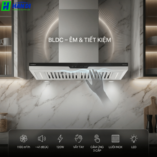 Máy được trang bị lưới lọc bằng inox giúp giữ lại các hạt dầu mỡ lớn, bảo vệ động cơ. Đặc biệt, bộ lọc khử mùi bằng than hoạt tính đóng vai trò quan trọng trong việc loại bỏ triệt để mùi khó chịu, mang đến không khí sạch sẽ, dễ chịu. Động cơ BLD tiên tiến cũng góp phần nâng cao hiệu suất hoạt động và tuổi thọ của máy.