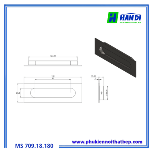 Sản phẩm có kích thước (Rộng x Sâu x Cao) là 50 x 13.5 x 150mm. Các thông số này được tính toán kỹ lưỡng, đảm bảo sự cân đối và phù hợp với đa số các loại cửa trượt, mang lại trải nghiệm sử dụng tối ưu.