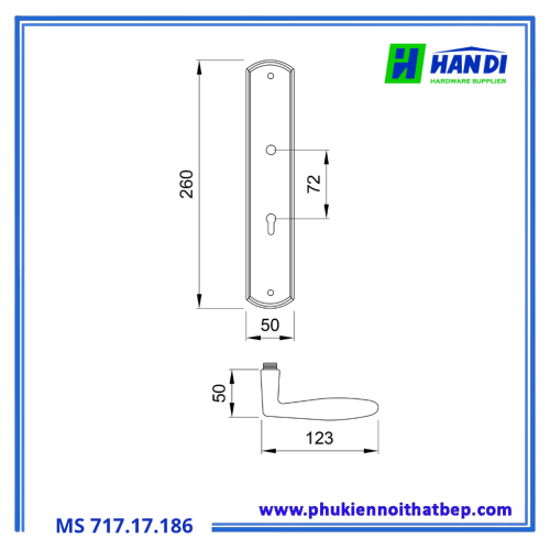 Hệ thống khóa đồng bộ: Khoảng cách tâm khóa C-C 72mm là tiêu chuẩn phổ biến, giúp dễ dàng kết hợp với nhiều loại thân khóa và ruột khóa (cylinder) trên thị trường.