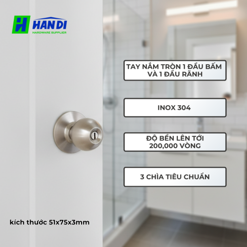 Lưu ý: Tay nắm tròn 1 đầu bấm dùng cho cửa WC, mở cửa từ bên ngoài bằng dụng cụ có hình dạng dẹp (vít dẹp,...) hoặc xoay tay nắm từ bên trong. Không khóa được từ bên ngoài.