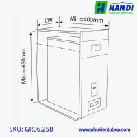Sản phẩm có kích thước lọt lòng tủ là 214mm, mặt thùng gạo được thiết kế để thay thế cánh tủ, giúp tiết kiệm không gian bếp. Mặt thùng gạo có kích thước 250mm x 650mm.