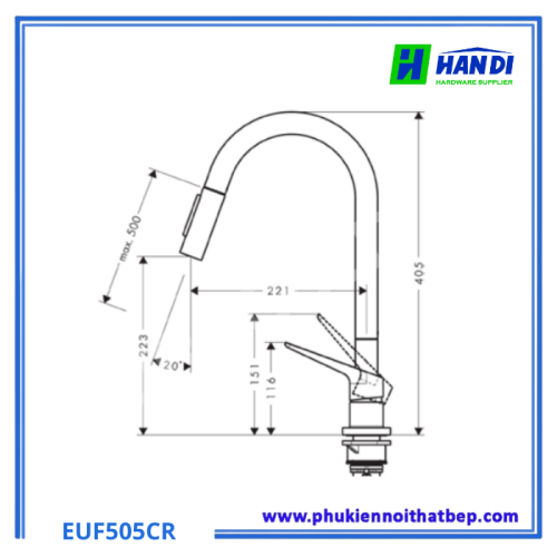 - Với chiều cao lắp đặt tối đa lên đến 500 mm, Vòi rửa bát đơn nóng lạnh Eurogold EUF505CR mang lại sự linh hoạt đáng kinh ngạc.