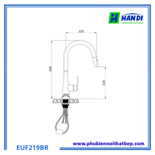 - Cơ cấu: Vòi dây rút tiện lợi, kéo dài đầu vòi ra khỏi vị trí cố định để vệ sinh các ngóc ngách của chậu rửa hoặc các vật dụng lớn một cách dễ dàng. Đây là một đặc điểm nổi bật của Vòi Rửa Bát Eurogold EUF219BR.