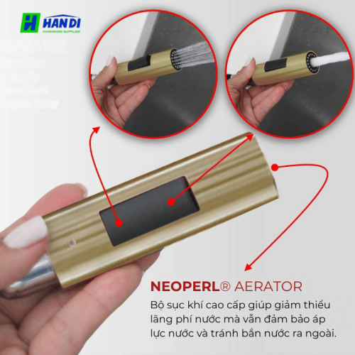 - Bộ sục khí Neoperl Aerator: Đây là một trong những điểm nổi bật của Vòi Rửa Bát Eurogold EUF221DR. Bộ sục khí cao cấp này giúp hòa trộn không khí vào dòng nước, tạo ra dòng chảy mềm mại, êm ái.