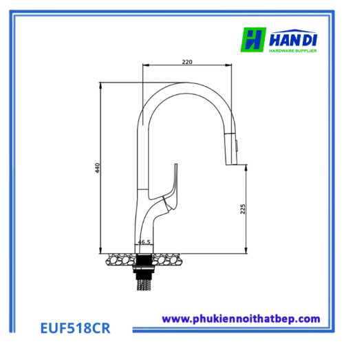 - **Kích thước sản phẩm:** Với chiều cao tổng thể 440 mm và chiều cao từ mặt bàn đến đầu vòi 225 mm, Vòi Rửa Bát Eurogold EUF518CR Dây Rút Inox 304 có kích thước lý tưởng, không quá cồng kềnh nhưng vẫn đảm bảo đủ không gian thao tác dưới vòi.