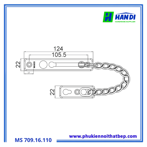 Với quy cách sản phẩm (RộngSâuCao) là 124 x 22mm, xích cửa an toàn này có kích thước vừa vặn, không gây cồng kềnh hay ảnh hưởng đến thao tác đóng mở cửa.